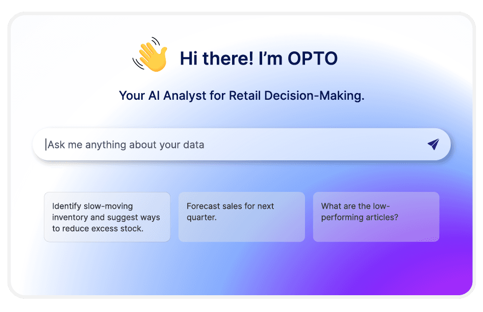 OPTO, Otacta’s chat agent, helps your retail operations be efficient. From optimizing stock levels to refining pricing strategies, OPTO is designed to support you in making data-driven decisions with ease.